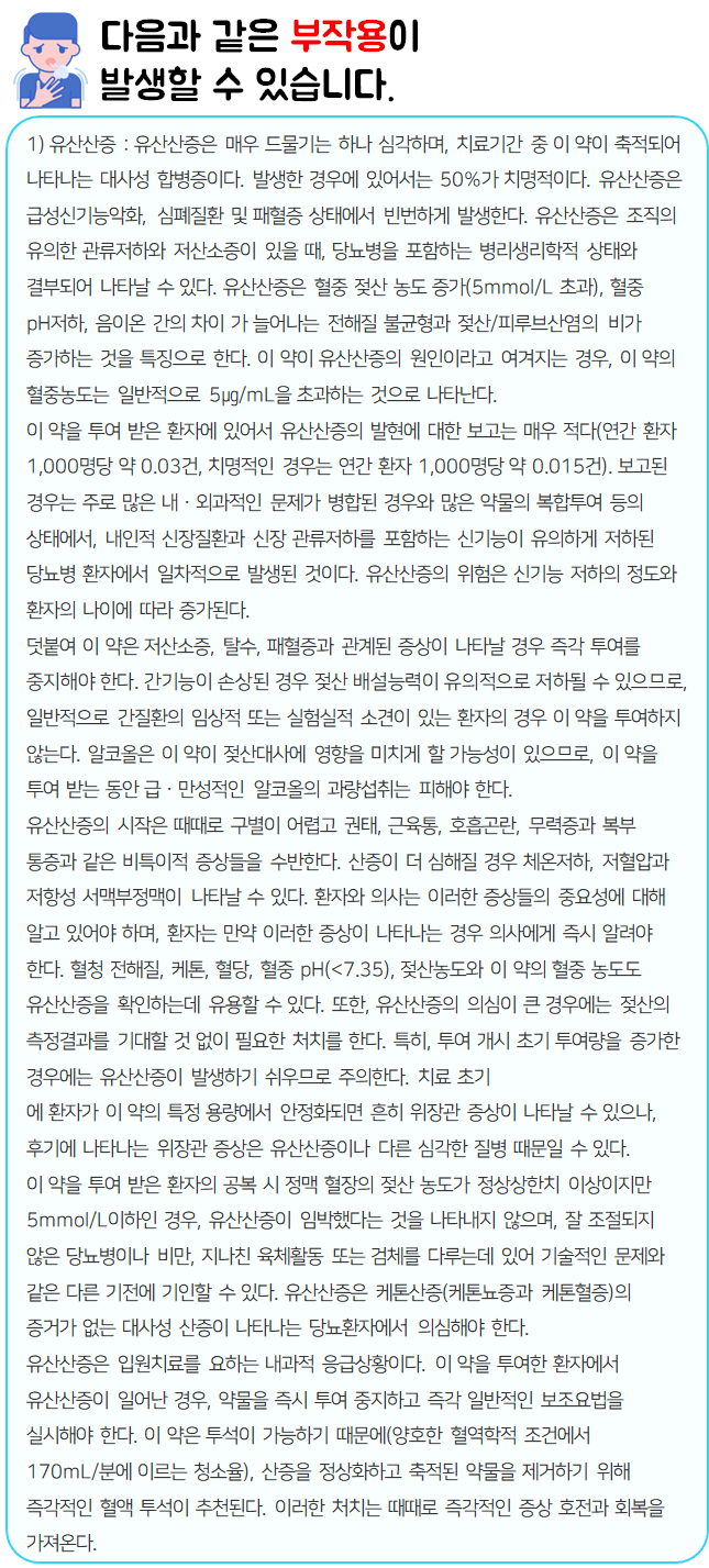 이 의약품은 간에서 당의 생성을 억제하고, 말초에서 당의 사용을 증가시켜 혈당을 감소시키는 약이니 참고하시길 바랍니다.