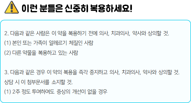 의약품의 경우 아래 내용을 꼼꼼하게 확인하신 후에 복용(사용)하셔야 이상반응 및 부작용을 최소화하실 수 있습니다.