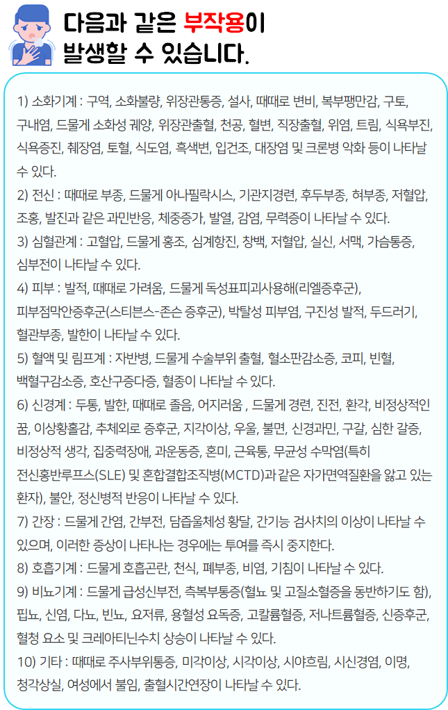 의약품의 경우 아래 내용을 꼼꼼하게 확인하신 후에 복용(사용)하셔야 이상반응 및 부작용을 최소화하실 수 있습니다.