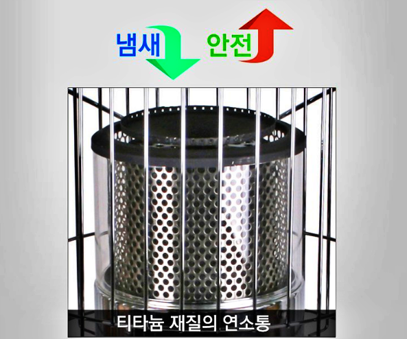 연소통 부분이 기존 스테인리스 소재에서 티타늄 재질의 연소통으로 변경되어 연소 작용 시 CO2가 줄어 들었고, 이에 냄새없이 사용이 가능하다는 장점이 있습니다.