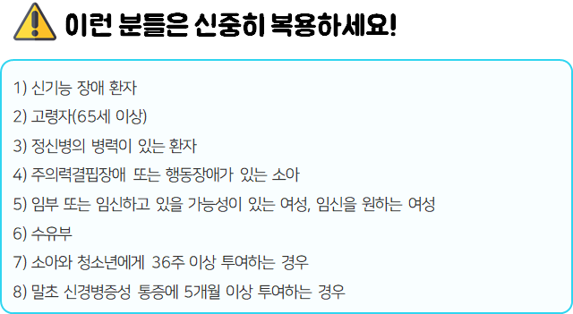 - 다음과 같은 증상을 보이는 사람은 약을 복용하기 전 전문가와의 상담이 필요합니다.