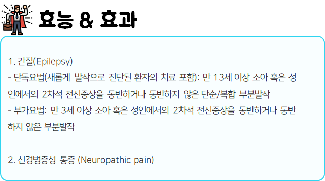 이 의약품은 '과도하게 흥분한 신경막을 안정시킴으로써 경련의 빈도를 감소시키고, 신경통을 개선하는 약'이니 참고하시길 바랍니다.